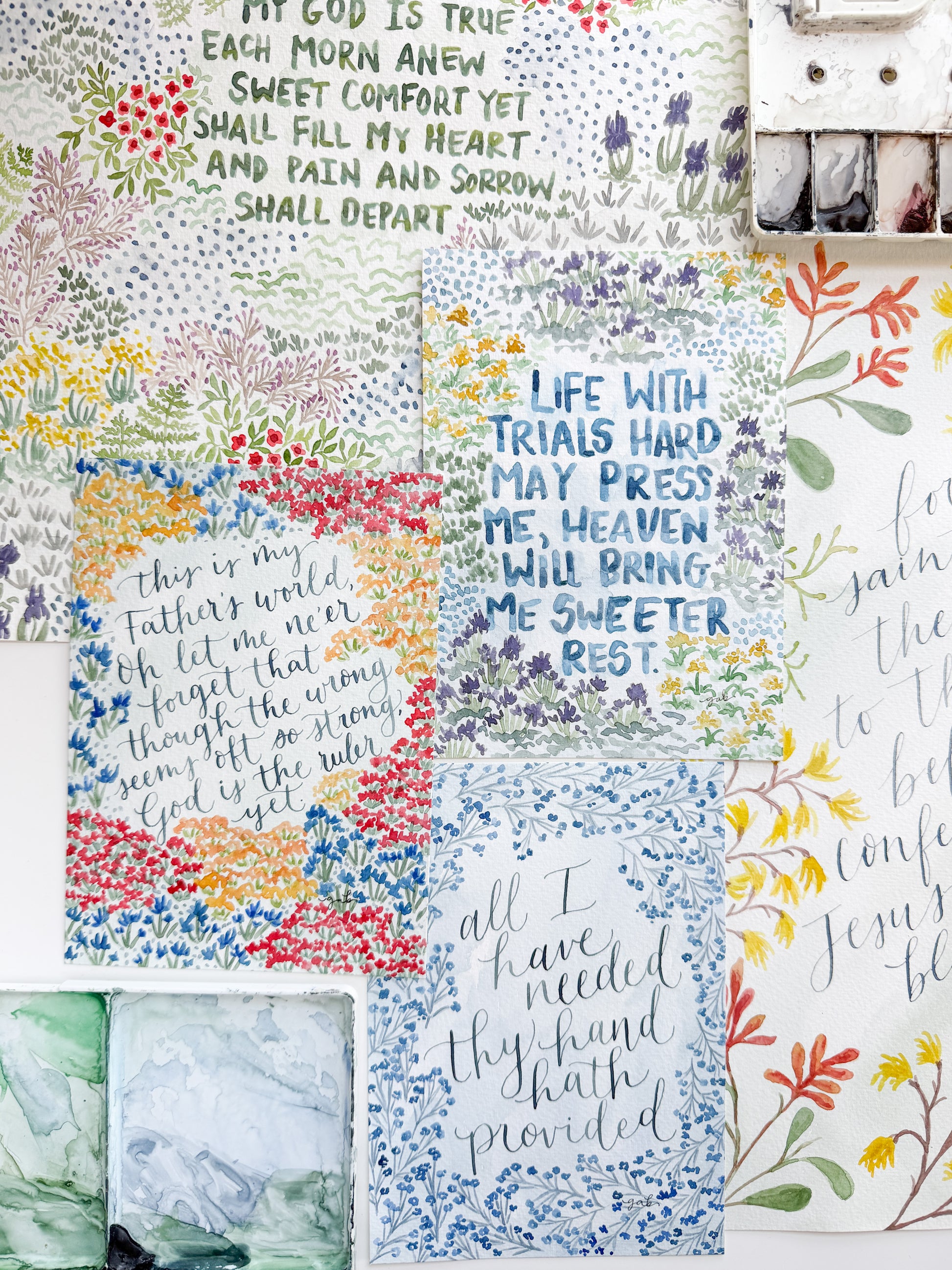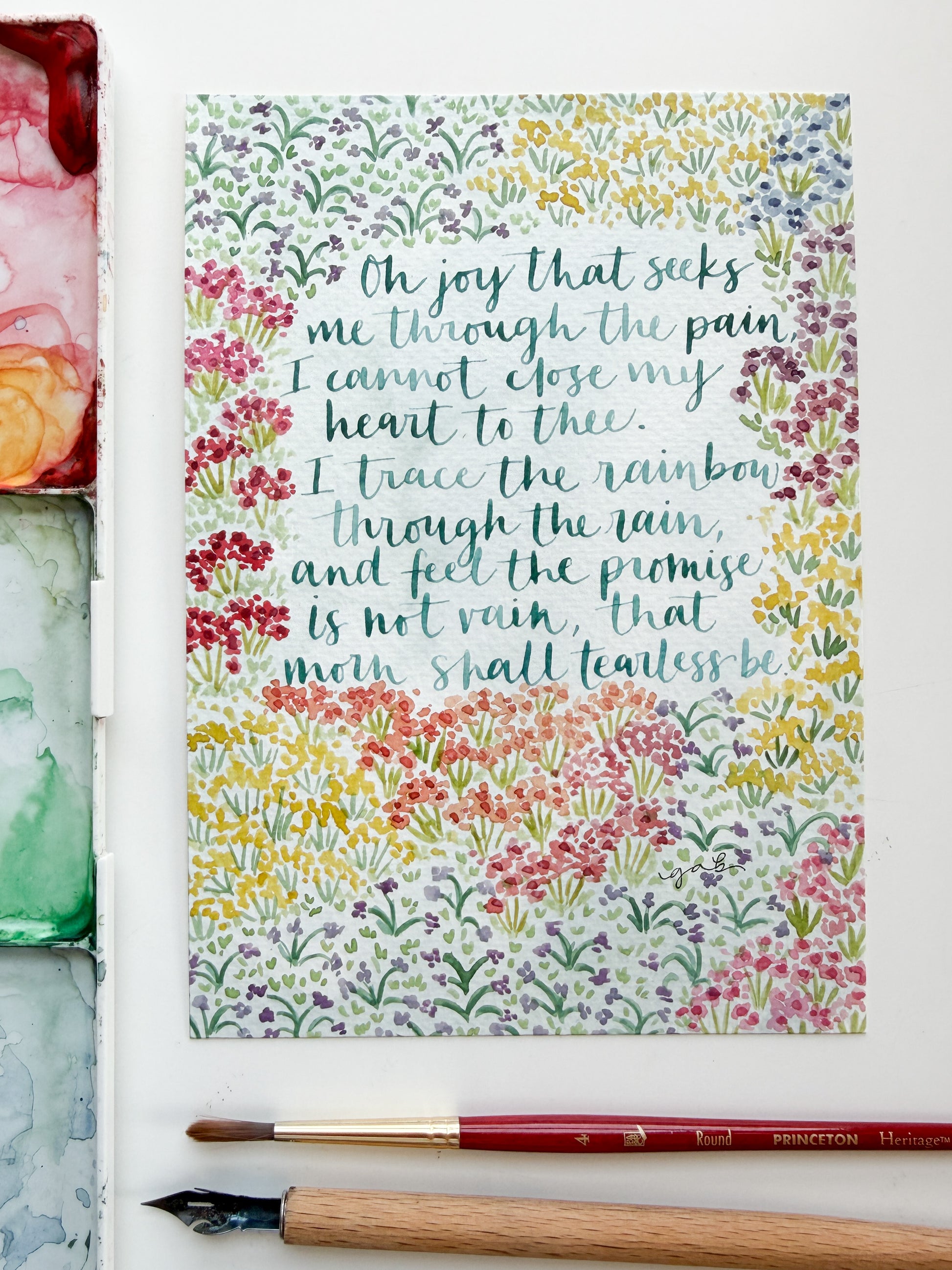 This is a 5x7 original watercolor painting of the lines "Oh joy that seeks me through the pain, I cannot close my heart to thee. I trace the rainbow through the rain, and feel the promise is not vain, that morn shall tearless be." from the hymn Oh Love That Will Not Let Me Go.