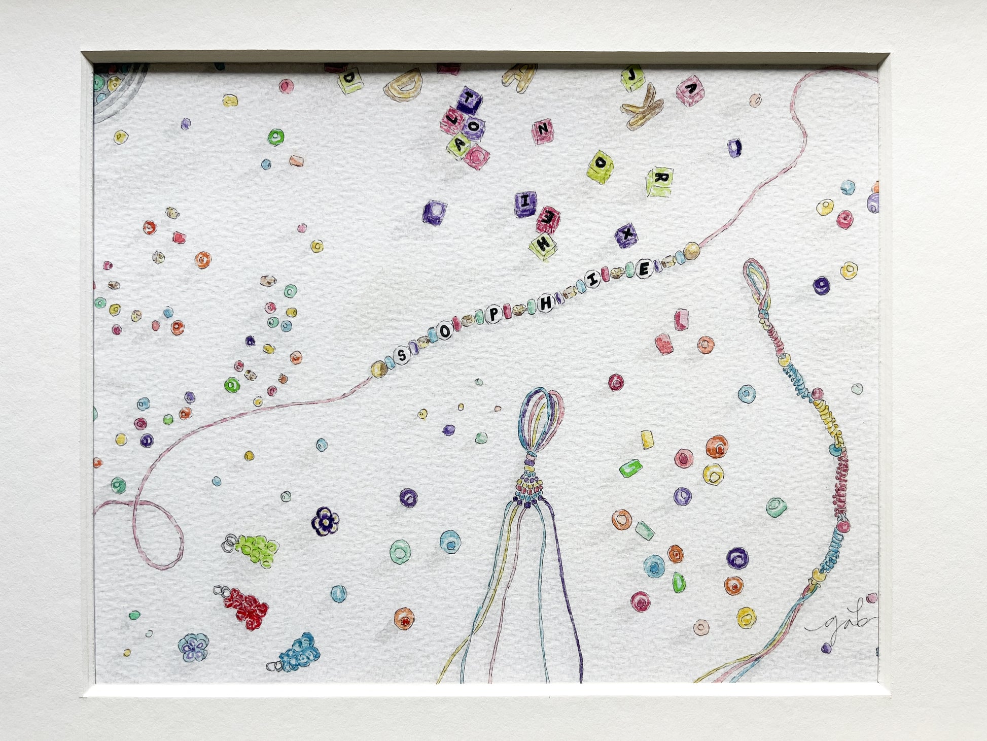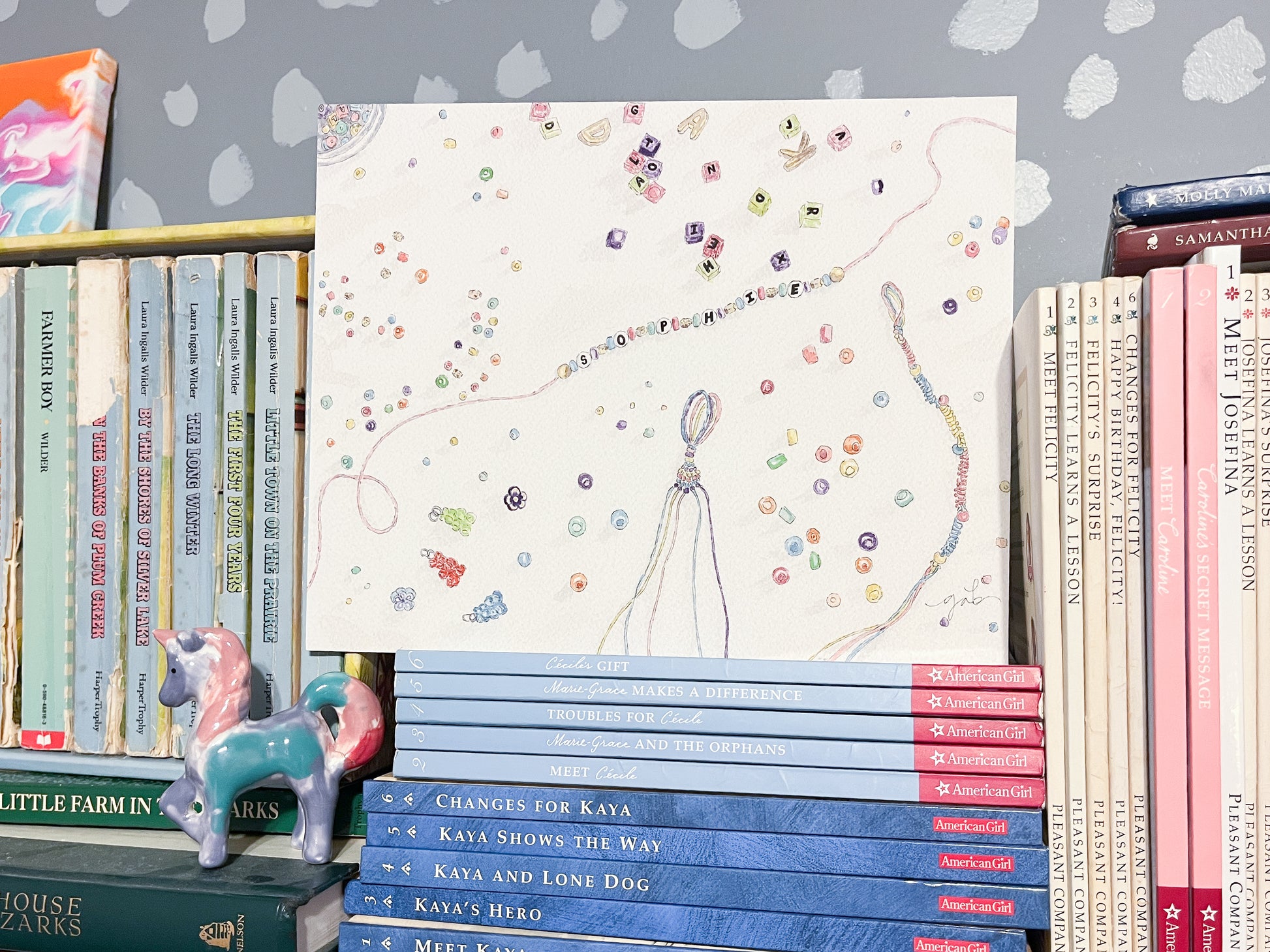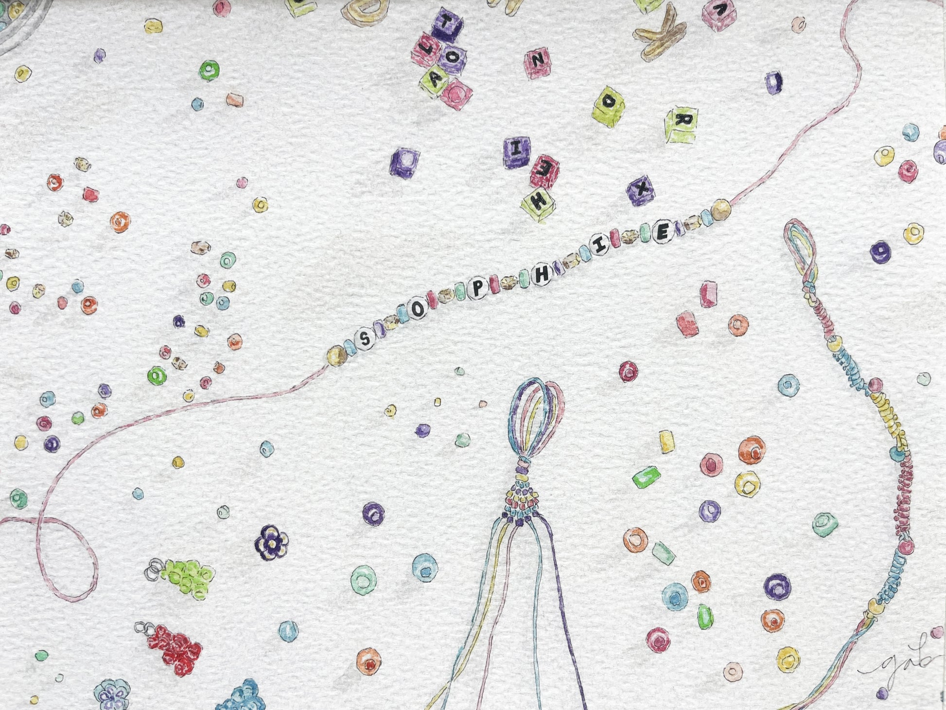 Use the personalization box to let me know what name or message you want in the letter beads of the friendship bracelet in the center of the painting.