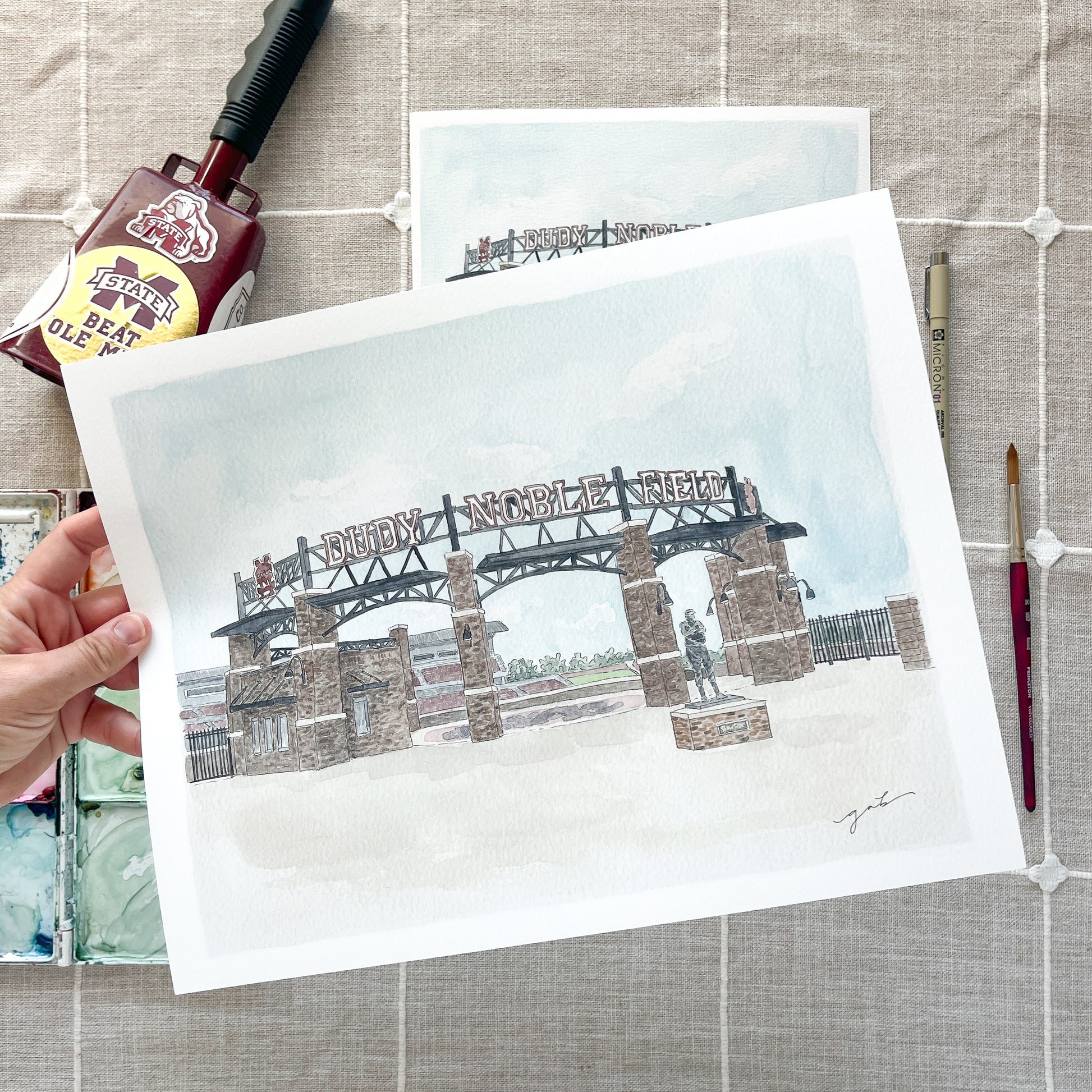 Giclee fine art print on textured watercolor paper, featuring a watercolor painting of of the famous Dudy Noble Field in downtown Starkville, MS. Available in 8x10 or 11x14.