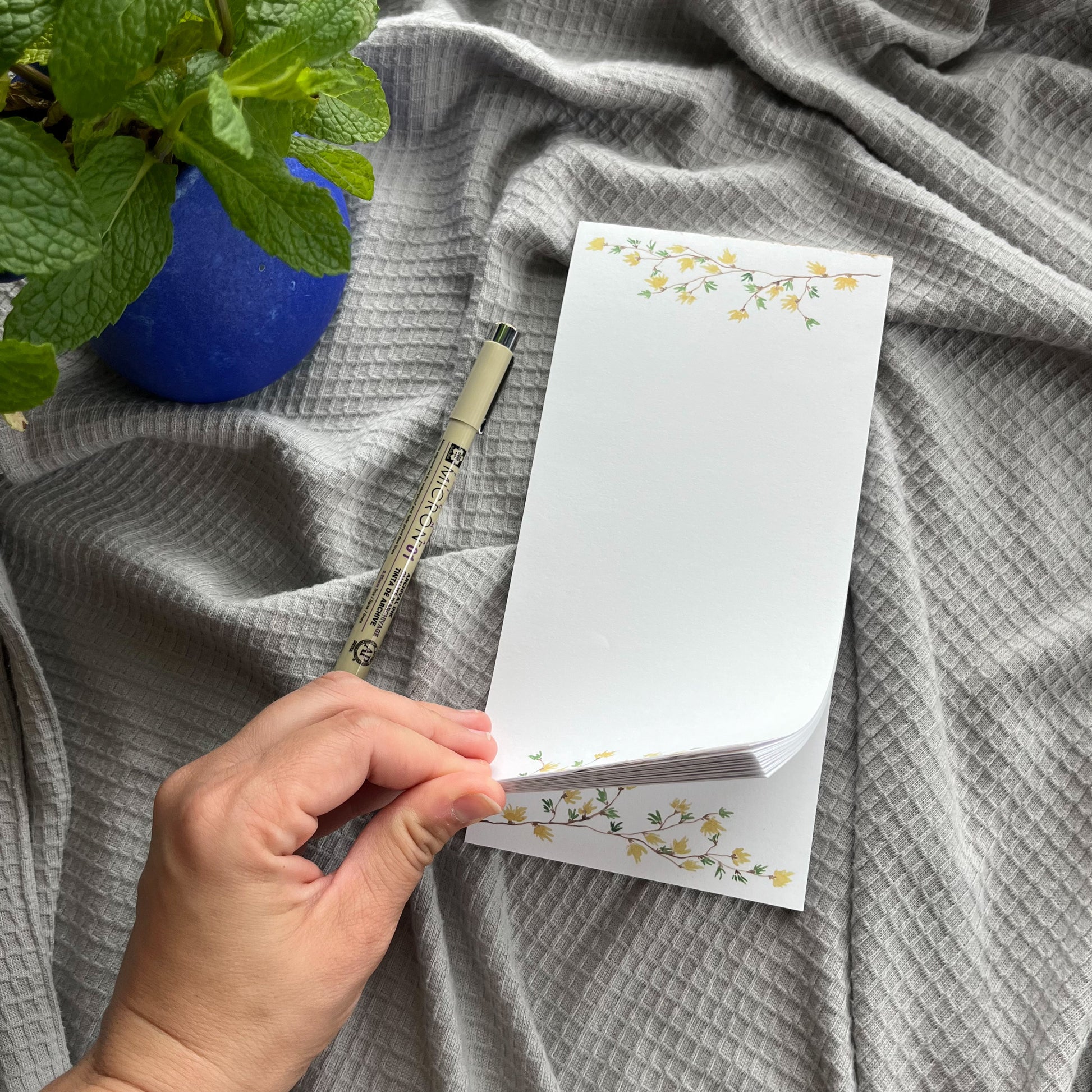 These notepads feature original Forsythia branch watercolor designs that will take your list making from boring to delightful!