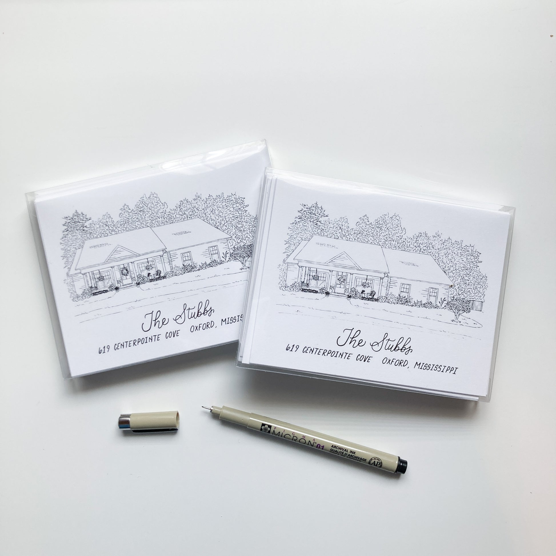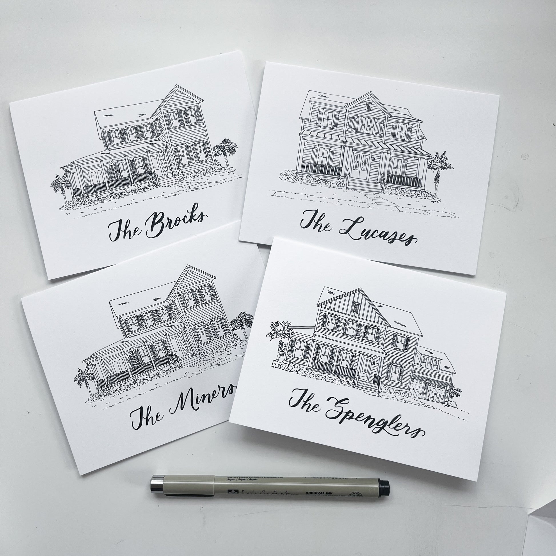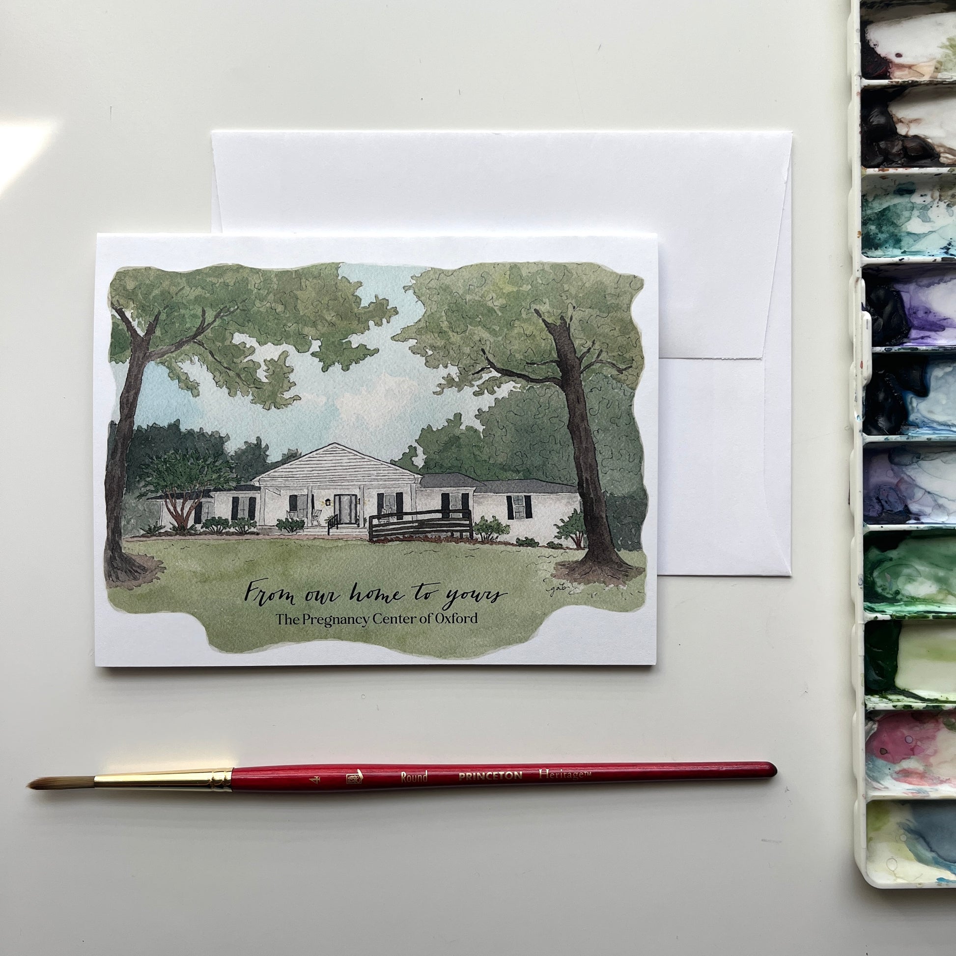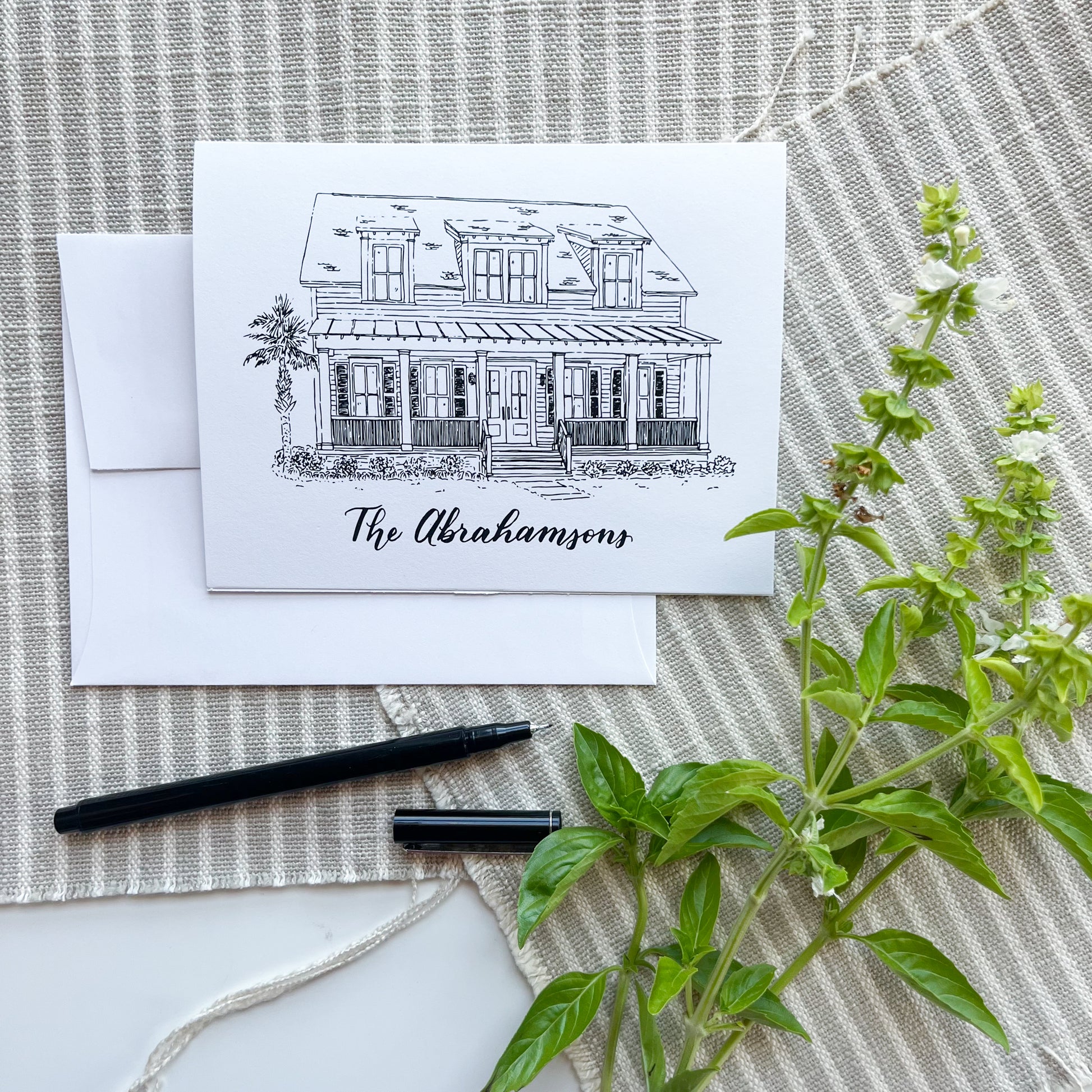 This is a set of 10 folded note cards featuring a pen and ink drawing, or simple watercolor painting of a house. Envelopes included.