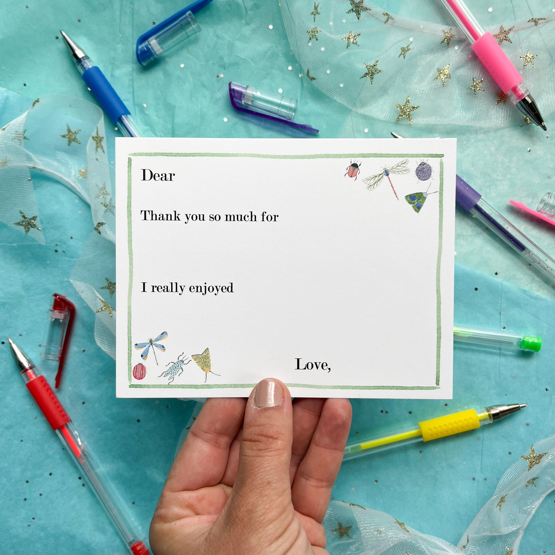 Kids can write thank you notes too! These flat cards leave space for your kiddo to fill in the details so they can say thank you to their friends and family without *quite* so much writing required.