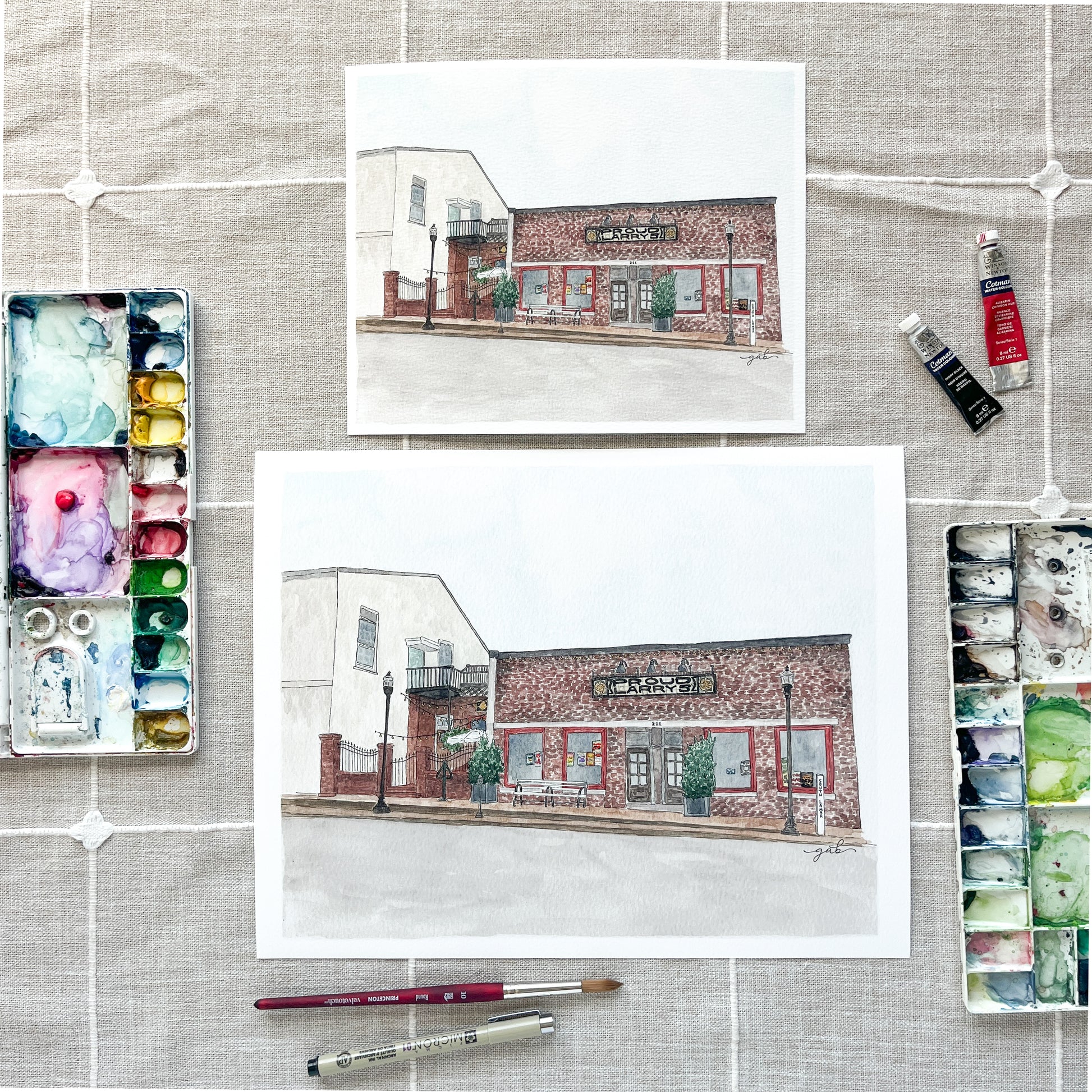 Giclee fine art print on textured watercolor paper, featuring a watercolor painting of Proud Larry's in Oxford, MS. Available in 8x10 or 11x14.