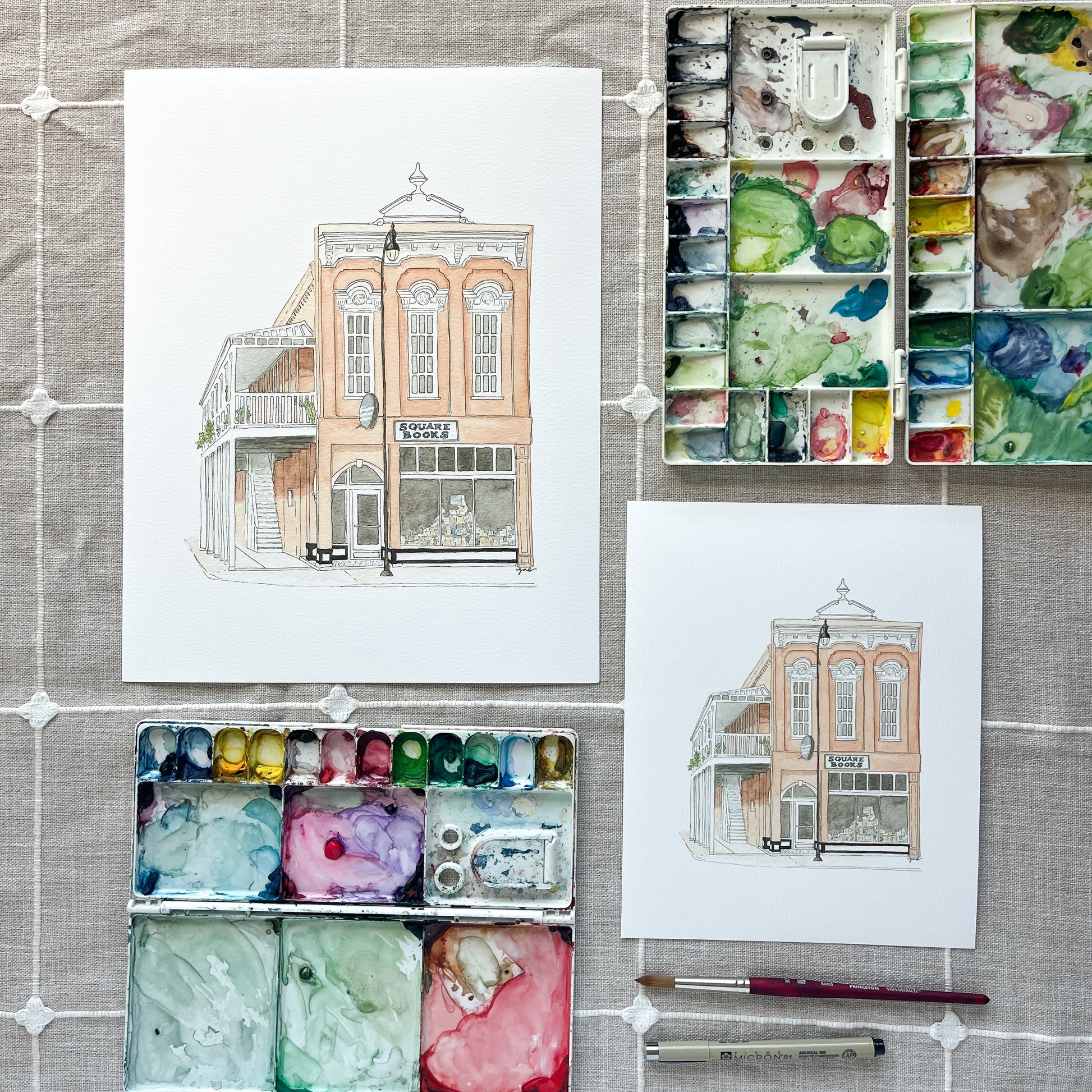 Giclee fine art print on textured watercolor paper, featuring a watercolor painting of Square Books in Oxford, MS. Available in 8x10 or 11x14.