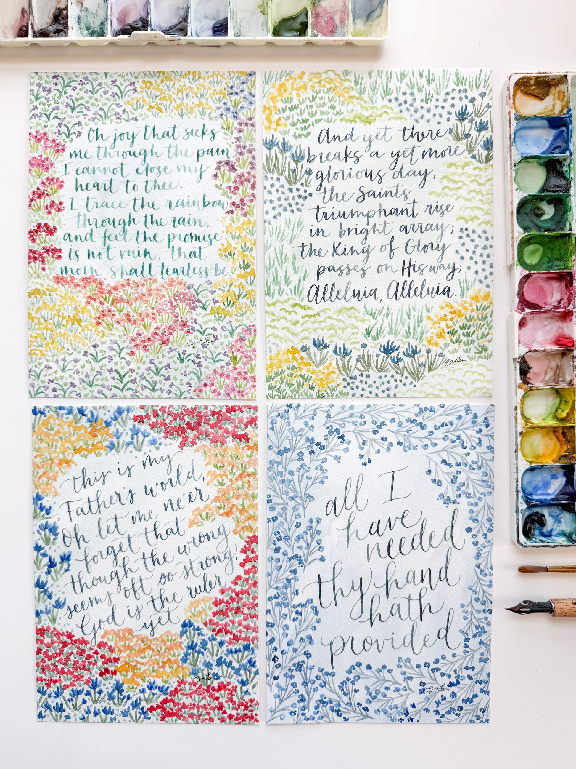 This is a 5x7 original watercolor painting of the line "All I have needed thy hand hath provided" from the hymn Great Is Thy Faithfulness.