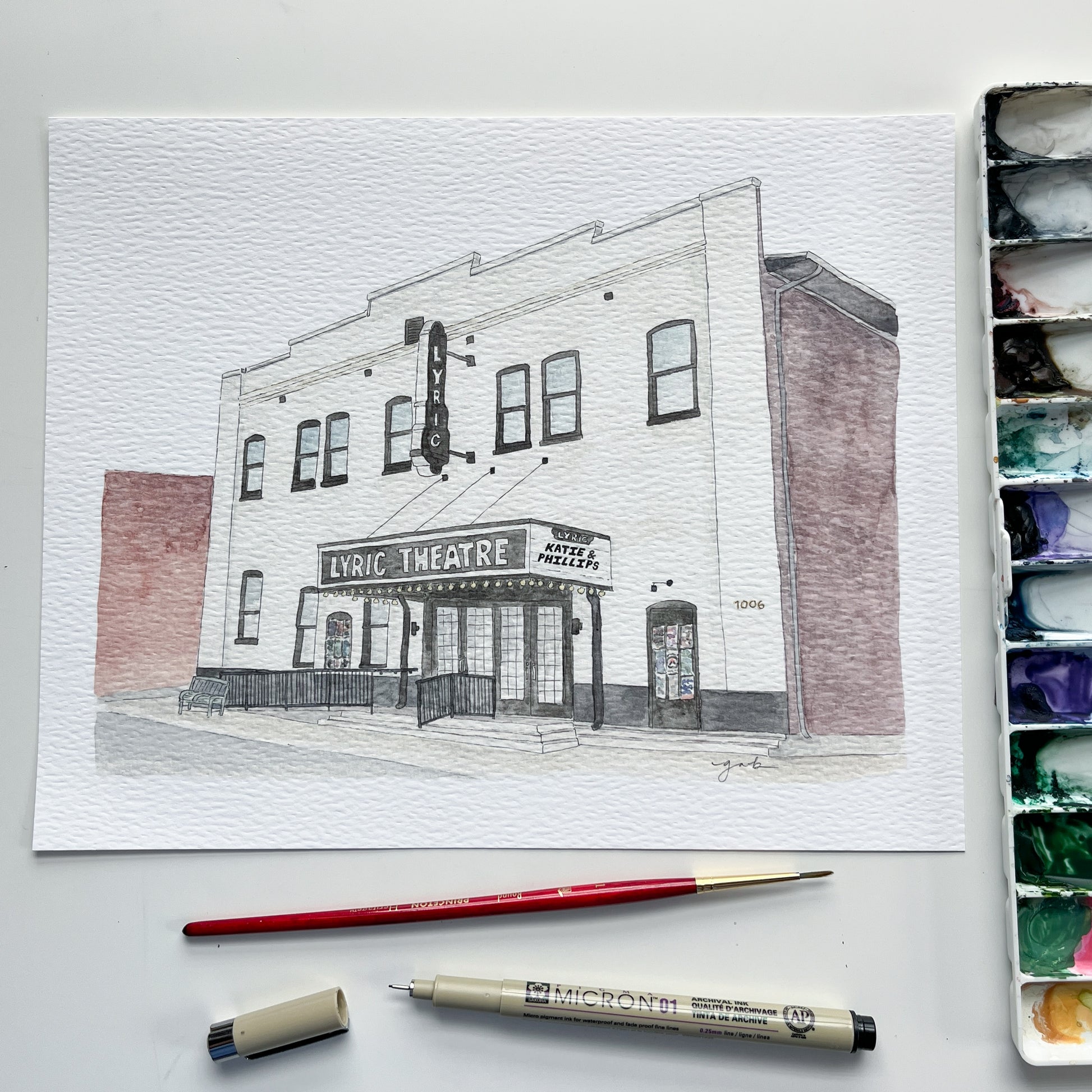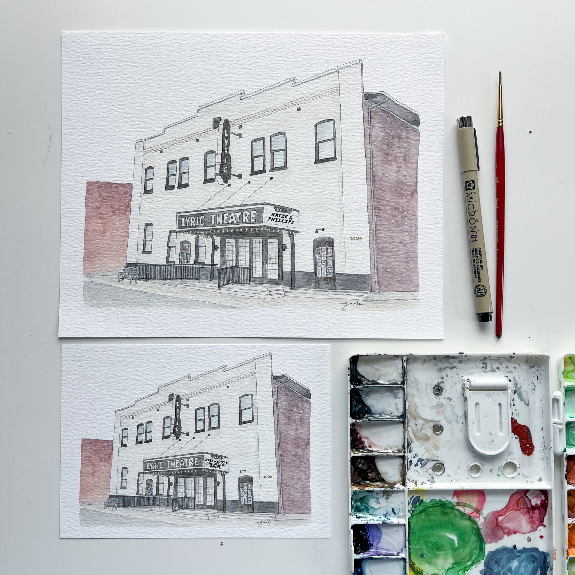 Available in 5x7 or 8x10, this is a giclee fine art print on textured watercolor paper, featuring a watercolor painting of The Lyric venue in Oxford, MS.